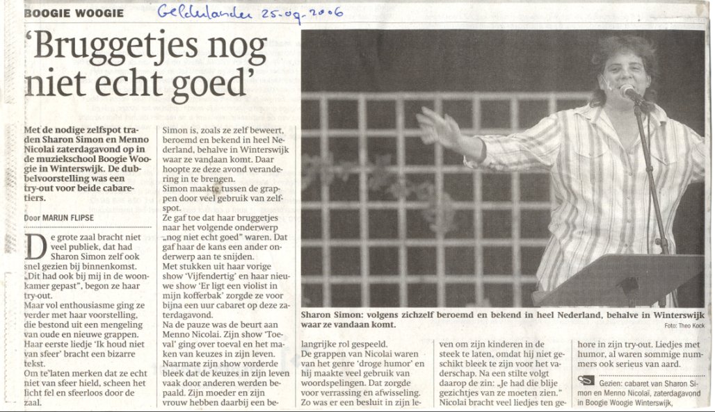 25 september De eerste voorstelling zit er op. Zaterdagochtend wakker worden volledig in paniek, hoe ik het in mijn hoofd haal om uitgerekend weer voor eigen publiek zoveel nieuw materiaal te gaan doen. Toch maar snel even naar Super de Boer om een taartje te halen? Maar in de loop van de dag, nam de rust toe en dus ook wel het vertrouwen. En het kwam goed. Beginnen met "Sfeer" en de Gambiaan, maar gedurende de show, steeds meer nieuwe verhalen en liedjes. Er moet nog een hoop geschaafd worden, maar ik heb er alle vertrouwen in. Inderdaad de bruggetjes; hoe ga je van een oude grap over een bevende (spellingscontrole er overheen) Gambiaan, naar een nieuw liedje over goede voeding? Nou, zo dus. De kok van Albert Heijn, die het overigens bijzonder goed deed. Blij alom en Menno deed het ook leuk. Maar wat een opkomst. Echt, in ieder ander dorp of stad, waar ze me niet kennen, is het drukker. Raar Winterswijk. De Gelderlander was er dan wel weer, incl. fotograaf. Gelukkig geen recensie, want dat kan echt niet met een try-out, maar een gezellig verslagje, hier te lezen. nb. In Tubantia vandaag hetzelfde artikel, maar dan met de foto 3x zo groot en in kleur. Ach ja, er was van het weekend verder weinig te doen in de Achterhoek. Behalve dan dat Paula is geboren bij de familie Perenboom. Weer zo'n prachtig Achterhoeks Portugeesje! |