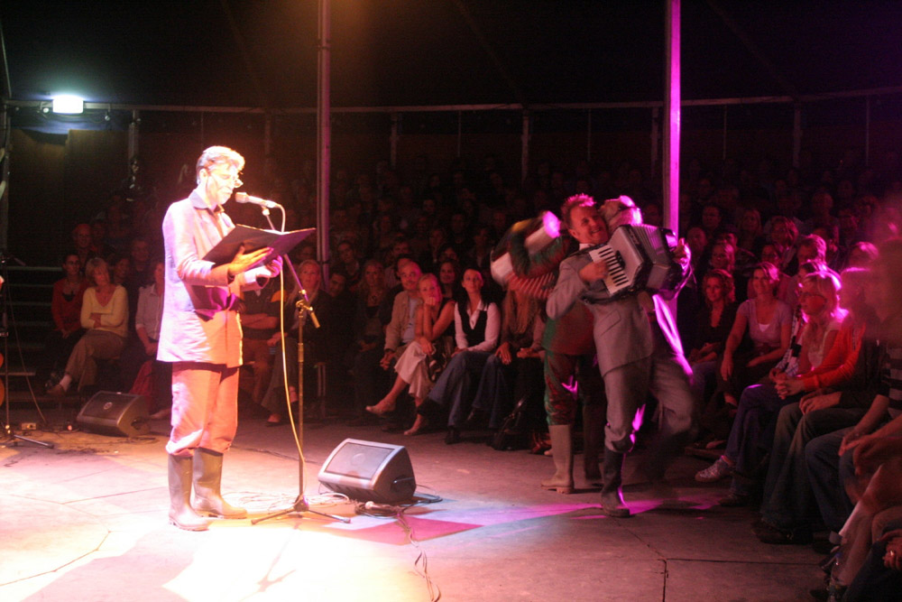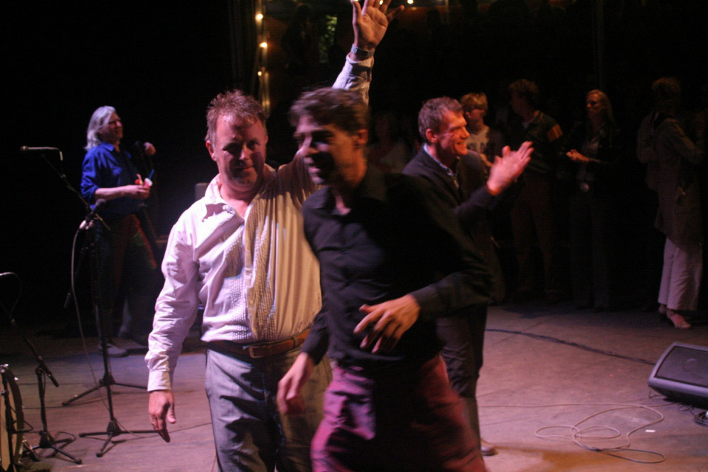 21 augustus Nou ja, ik ga niet lopen klagen over het slechte weer en hoeveel last al die buiten festiviteiten daar wel niet van hadden Het voordeel is; je komt 's avonds laat thuis en zo'n warme douche is echt geweldig! Het nadeel, als je zo'n festival presenteert; je kunt niet weg. Bij de eerste stortbui, zag ik, overigens droog aan de zijkant van het podium,vanuit mijn ooghoeken al mijn vrienden met parapluutjes en plastic over zich heen, het terrein afvluchten...de helden! Toch werd het verder een bijzonder leuke dag, met als hoogtepunt, het bijzonder hippe bandje De Tafel van 11. Daar waar ik in de PR van het festival niet werd meegenomen, dat maakte de Gelderlander vandaag in al het overdrevene goed. Lees hier het artikel. |