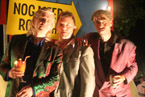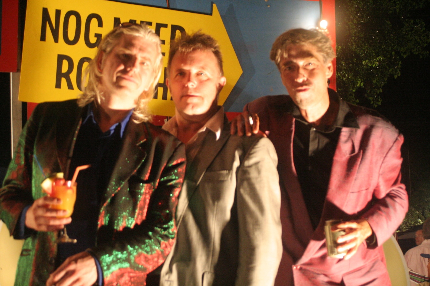 18 augustus Wezen paraderen in Amsterdam. Wederom was het reuze gezellig. En wederom de geweldige voorstelling "Nog meer rottigheid" gezien. Een liedjesprogramma met Maarten van Roozendaal, Bob Fosko en Pierre van Duijl, die naar mijn mening veel te onbekend is. Wat een prachtige liedjes en wat een geweldige muziek! En omdat ik van de voorstelling in een tentje daar op volgend niet echt blij werd, terwijl dat wel de bedoeling was, besloten we de avond goed af te sluiten met nog meer rottigheid. Wachtend in de rij, poseerden de heren gewillig voor de camera van Irene, die ik gelukkig bij me had voor de foto's (en ook wel de gezelligheid). Want mijn mobieltje trok het niet. Voor een vergroting, ff klikken. |